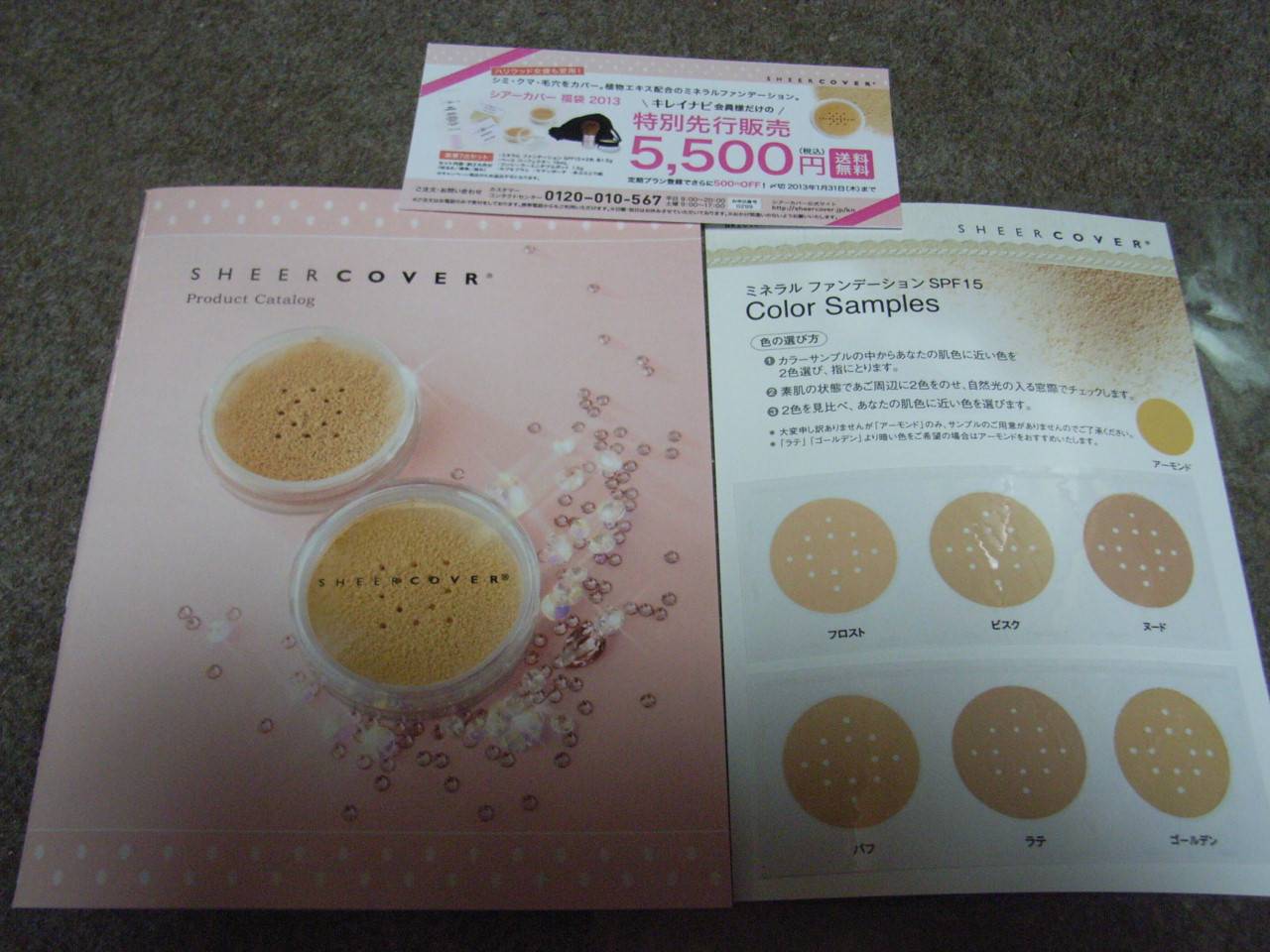 シアーカバー シミ・ニキビ痕・赤ら顔等をカバー、あらゆる肌色にフィットするミネラルファンデーション です。 キレイナビのクリスマスパーティーに参加した際にいただいた、色見本です。 薄づきなので、カバー力をそれほど求めていない私には向いているかもしれません。 ただ、ずっとリキッドファンデ派できたので、コツがいりますが。