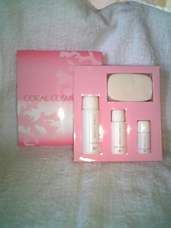 沖縄のサンゴパウダー配合の ソープ、ローション、ミルクローション、スペシャルエッセンス のトライアルキットです。 ソープで余分な皮脂や毛穴の汚れをすっきりと落とし、 サンゴのミネラルを含んだローションで肌を整え、 ミルクローションが、保湿して、乾燥や紫外線から肌を守り、 サンゴパウダーと植物エキスをバランスよく配合した スペシャルエッセンスが みずみずしい透明感のある肌に導いてくれます。 使い心地はさらっとしていて、すべすべという感じが良いです。