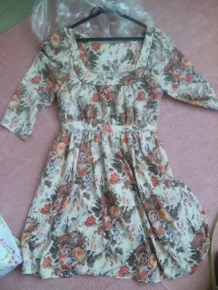 冬のバーゲン戦利品10 レトロな花柄ワンピースです。 襟ぐりが大きくあいているので、小顔効果もあります。 白色がメインのワンピースなので、春頃にも使えそう。 ウエストの部分が締まっているので着るとラインがキレイです。 女らしいシルエットになります。