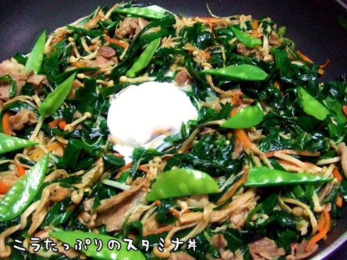 旬の柔らかなニラをたっぷり使ったスタミナ丼です。 1束なんてあっという間に食べられちゃいます。 ニンニクもたっぷり効かせれば簡単レシピなのに疲労回復バッチリです! ,湯が沸いたら卵を入れ、すぐに火を止め20分ほど放置し温泉卵を作ります。 ▲侫薀ぅ僖鵑覇敍を炒めたら、人参、えのき、水菜、ニラと火の通りにくい順に加えます。 △砂糖・醤油・みりん・酒・味の素・塩・ニンニクで味を整えたらご飯の上に乗せ、温泉卵、きぬさやを飾れば出来上がり! 今回は切らしていましたが、もやしをどっさり加えるとなお一層...