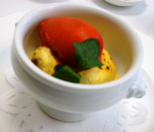 春の装いをしたデザートのご紹介です。 'ストロベリーシャーベット・グラタン仕立て'。 とってもおしゃれな一品。 ストロベリーシャーベットの甘さもちょうどよく、その下にある黄色の部分は卵黄と生クリームをホイップ仕立てにしています。 さらにちょっと焦がしてグラタン風に。 そして、その下にはなんと、フレッシュなストロベリーがごろごろ隠れていました! 遊び心満点のスイーツでお味もパーフェクト。 フレンチレストラン・C'est la vieにて。