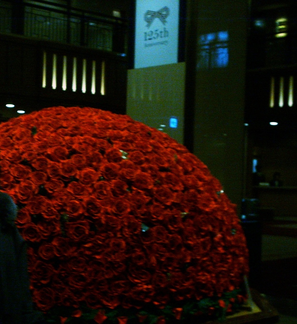 帝国ホテル125周年記念として本館正面玄関に飾られているバラです。 「アモローサ」というプリザーブド・ローズです。 しかしながらバラそのものの品種については残念ながらトレースしつくせませんでした。 深紅の大きなバラ、何本あるのでしょうか・・・見ごたえがあり、圧巻です。銀座へ出た際には是非、一目見てバラの美学に感動するのもいいですね。