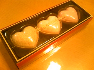 coucouで購入した入浴剤。 香りの違うハートが3個セットになってます。 チョコの香りってのも入ってるので、 お風呂好きな彼へならバレンタインの贈り物にも最適かも。 160Lに1個使用。色はうすーく茶色になる感じでした。 香りはチョコよりもバニラに近かった気がします。 お湯質の変化はほとんどないので香りを楽しむのがメイン。 値段相応でした。