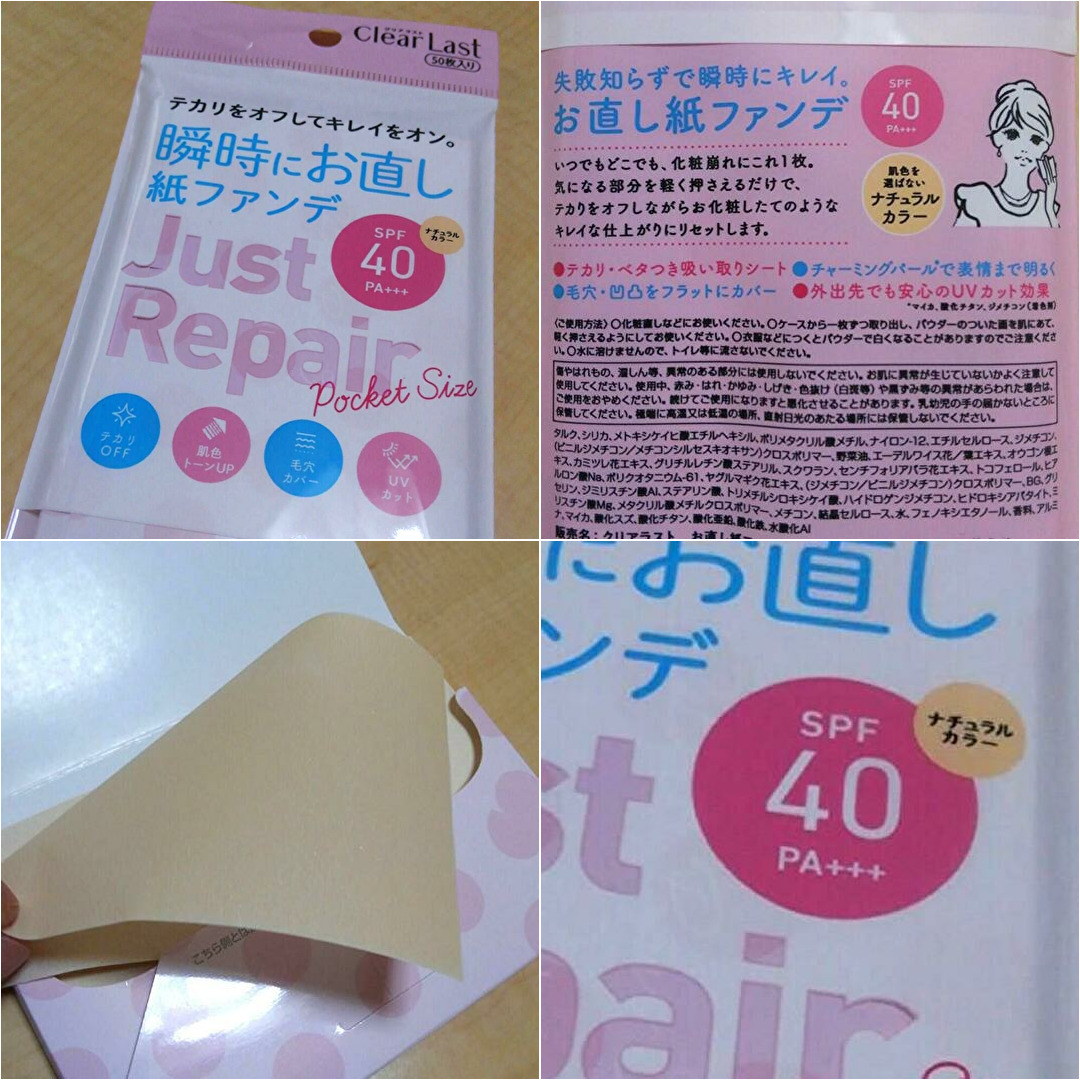 クリアラスト お直し紙ファンデ!! いつでもどこでも、お化粧直しにはこれ1枚! 一見あぶらとり紙みたいに見えますが、フェイスパウダーが付いていて、気になる部分を押さえるだけで、テカリ・ベタつきを吸い取って、毛穴・凹凸をフラットにカバーしてくれる「お直し紙ファンデ」なんです。 外出先で気になったら、気軽にお直し。 カラーはナチュラルカラーで、肌に自然に馴染む感じ。 UVケアも考えたマルチナシート。 厚さもなくてかさ張らないから、ポーチにそっと忍ばせておけば、いつでもどこでもお直し出来ます。...