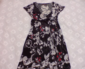 薄手のベロア素材、黒地に赤とグレーの花柄で、 ウエストにはリボンを結ぶ紐が付いています。 Aラインの膝丈で形がとってもきれいです。 新宿ルミネで見つけ、お手頃価格8,500円でした。 ちょうど可愛いワンピを探していたので、 とってもラッキーな「冬のバーゲンの戦利品」です♪