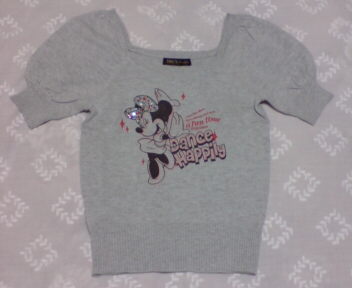 思いっきり一目惚れ。 淡いグレーの薄手半袖ニットです。 ミニーちゃんのデザインに、 キラキララインストーンまで付いていて、 文句無しの可愛さです。 半袖ニットって、室内の暖房があたたか過ぎる冬に ほんとに大活躍しますよね。 お値段もこの可愛さにしてはとってもお得で、 なんと6,500円になっていました。 これぞまさに、可愛く嬉しい「冬のバーゲンの戦利品」です!