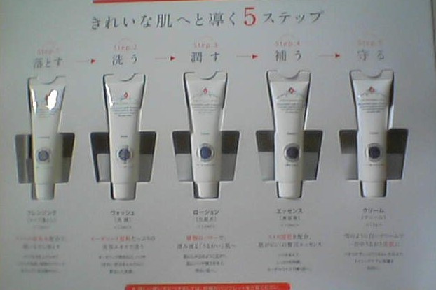 クレンジング、洗顔フォーム、ローション、クリーム、エッセンスの5種類がチューブに入っています。 残暑厳しかった頃はローションだけでよかったのですが、 最近、涼しくなってきて肌が乾燥するようになって、クリーム、エッセンスが保湿に大活躍です。 どれも天然成分しか使っていないということもあって、肌に負担がなく、できものが出来たりすることもなく、香りも優しい花の香りで、いい感じです。