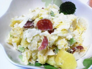 ポテトサラダに茹でたブロッコリーの茎をこまかめの角切りを入れました。 ハムでもいいですが、今回使ったのは、サラミ。 意外と合うし、ブロッコリーとも相性がいいです!