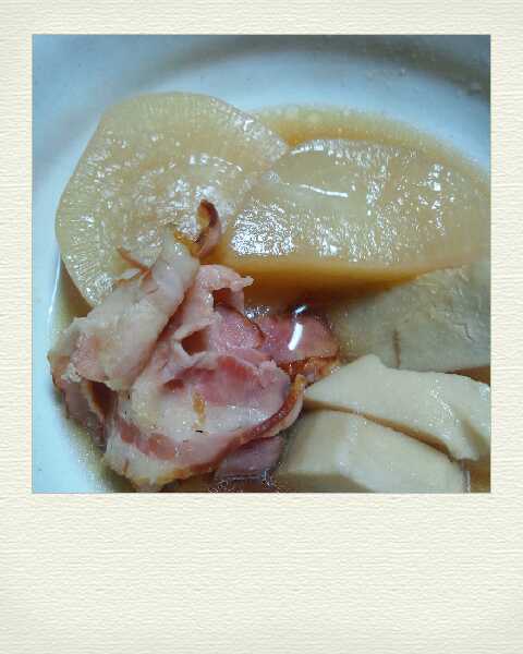 和風一辺倒な大根の煮物を、ベーコンを入れたコンソメスープで炊いています。 下茹でした大根、ショルダーベーコンをコンソメスープで ぐつぐつさせただけの簡単料理です。 ベーコンの旨みも吸ったコンソメ味の大根煮も 悪くはないですよ。 お写真には、一緒に煮た里芋の親芋も写ってます。