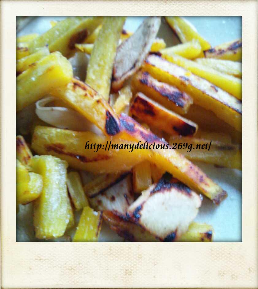 野菜チップスって美味しいけれど、油で揚げるのが面倒だし、 カロリーも心配。 というわけで、ヘルシー化の定番! レンジでチン♪を使ってみました。 食べやすい大きさに切ったさつまいもを やわらかくなるまで、ちょっとだけチン。 薄〜く切ったごぼうと一緒に、焼き色が付く程度に フライパンで炒めてみました。 油で揚げたときのようなカラッとした美味しさはないけれど、 まぁまぁの出来上がりでした。及第点かな。 なにより旬のお野菜たちなので、美味しさは抜群。 味見と言いつつ、食べ過ぎてしまった感さえ...