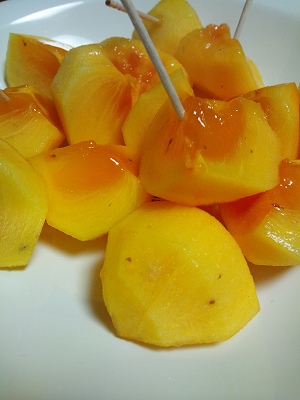 秋の果物といえば、梨&柿。 みずみずしさから、梨の方がカロリーが低いと思ってましたが、 柿の方がヘルシーフルーツのようですね。 「柿が赤くなれば、医者が青くなる」。 実際、ビタミンCやビタミンK、カロチンなどを多く含んでいる、 栄養価の高い果物なんだそうです。 若いころは、好んで食べなかったフルーツの一つでしたが、 30も半ばになって趣向が変わってきたのか、 なんとなく食べたくなるフルーツになってきました。 体が欲するようになってきたのかもしれませんね(*^_^*)。