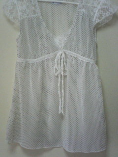 これは去年の誕生日にもらいました 透けてる所とドット柄がお気に入りです♪ 下に白のキャミと合わせたりして着てます でも今は春なのでカーディガンと合わせて着ようかな♪