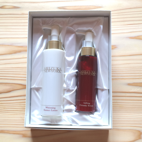 ニューヨークでエステティシャンとして活躍するバーンスティーン静さんが作ったスキンケア。その中の、化粧水と乳液がセットになったボックスです。洗顔後このふたつでスキンケアが完了する、オールインツー化粧品とのことです。 ホワイトニングエッセンスローションは、薬用美白化粧水です。プラセンタ、コラーゲン、ヒアルロン酸、セラミドなどが配合されていて、サラッとしたテクスチャの中にも若干のとろみを感じます。お肌にぐいっと入ってくれて、潤してくれます。使っているうちに、肌が明るく整ってきたようにも感じます。抗シ...