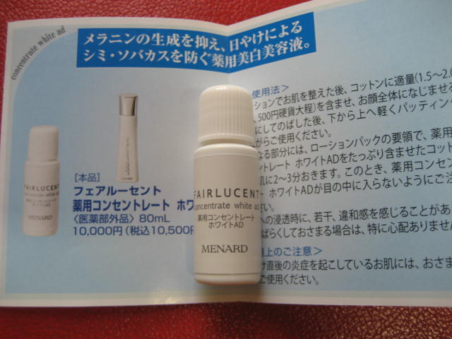 薬用コンセントレートホワイトADのサンプルです。 薬用美白美容液です。薬用というのがスキンケアに効果ありそうで安心感がありますね。 肌への浸透感と使った後のしっとり感がいいです。 美白効果があるのもうれしい。 お値段は高めですが、安心感と信頼性があるので値段に合った価値があると思います。