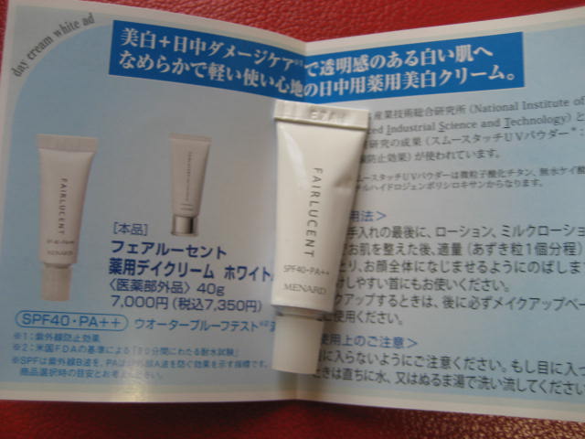 薬用デイクリームホワイトのサンプルです。 日中用の美白クリームで、UV効果もあるので使いやすです。 使った感じは、べとつきもなくファンデーションのノリもよいです。 UV対策と美白効果の両方のスキンケアが手軽にできるのがいいですね。 毎日の事なので簡単なのがうれしいです。