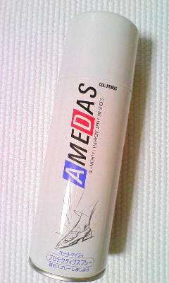 梅雨対策GOODS、1 AMEDAS プロテクティブスプレーです。 説明を読むと‥ 防水・撥油・防汚の効果を与え、靴を保護するプロテクティブスプレー。 との事。 注意する点は、吸い込むと有害、必ず屋外で使用。 靴やカバン、衣類?に使えるみたいですが、わたしは靴に使ってます。 軽くスプレーするだけでいいので簡単です。 1年中使えるのはもちろん、雨が多い梅雨の時期などは このスプレーをしておけば、 急に雨が降ってきて靴が塗れてしまったとしてもなんとなく安心かも。