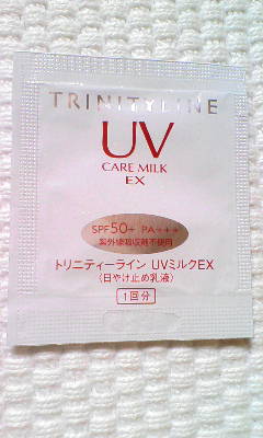 トリニティーラインのUVミルクEXです。 SPF50+ PA+++で、 紫外線吸収剤不使用で紫外線散乱剤を採用との事。 わたしは日焼け止め選びでは‥出来れば紫外線散乱剤の方がいいので サンプルでいろいろ試してから買うようにしてます。 白浮きもせず下地としても良さそう。気に入りました。