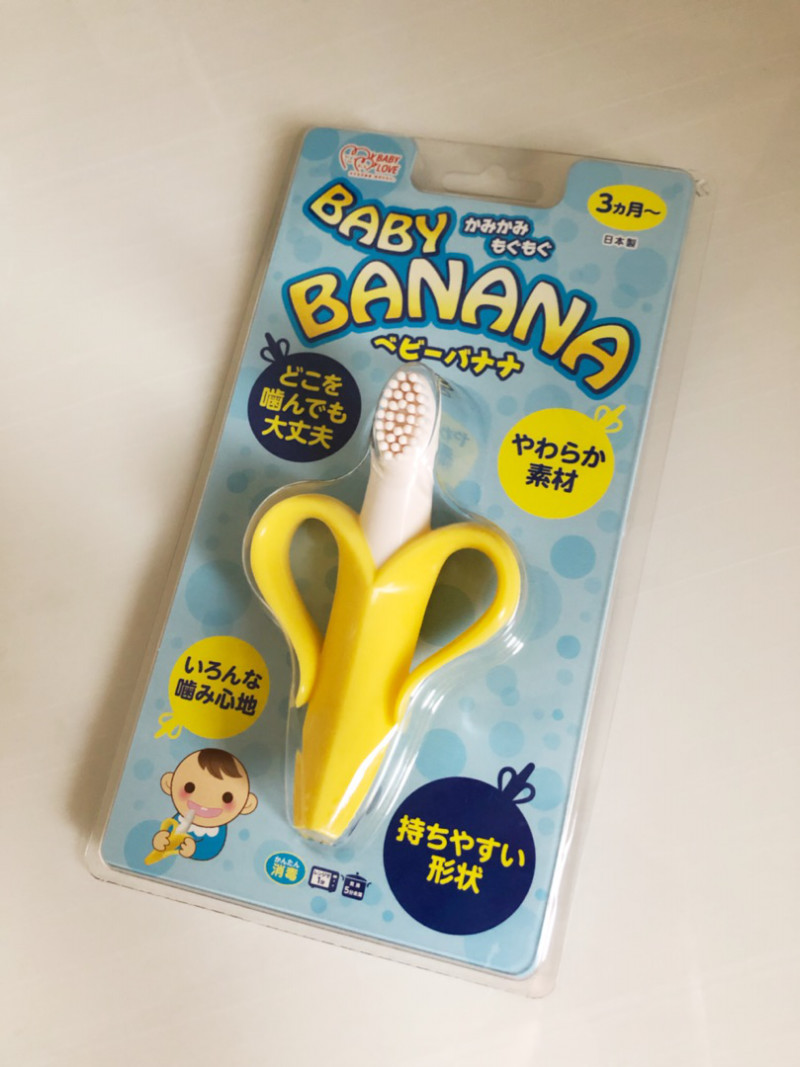水色と黄色を基調としたパッケージで、かわいいです。 バナナの皮をむいた状態で、バナナの部分がブラシになっています。 赤ちゃんでももちやすい形状です。 生後3か月以上の乳児の歯固めのための商品です。 歯が生えてくるタイミングで、ムズムズする違和感を感じ機嫌が悪くなってしまいますよね。 夜泣きしたり、なんでも口に入れてしまう赤ちゃんに対し、誤飲を防いだり顎の噛む力をつけるために役立ちます。 歯科衛生士のママさんが開発した商品なので、信頼できます。 シリコーン樹脂100%でできているので、安心&安全です。...