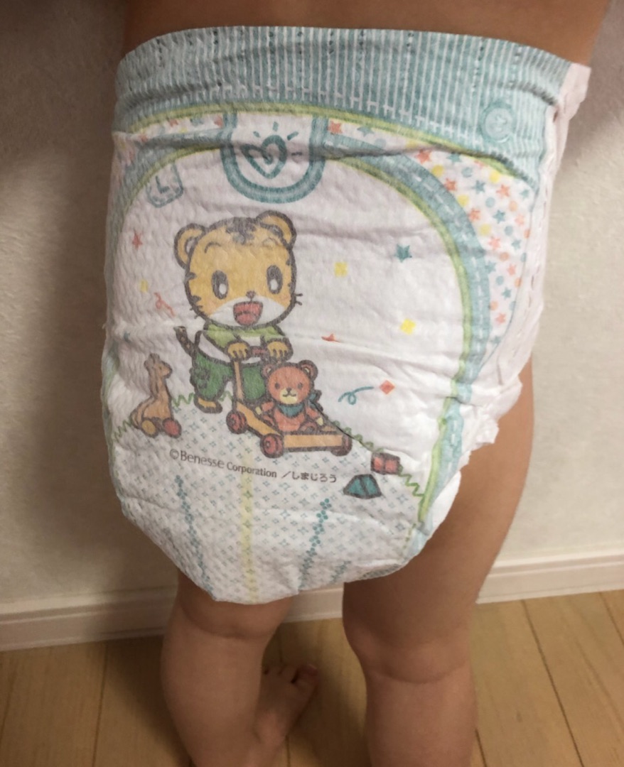 白い肌着を着たにっこりかわいい笑顔の女の子が、おむつをしている写真のパッケージです。 「しまじろう」が笑顔でクマさんを乗せた台車を押しているイラストがデザインされています。 前側には、猫ちゃんがひらひらと飛んできた蝶々を前足でこちょこちょして、じゃれているイラストで、ほっこり癒されました。 おむつ替えするたびに、楽しい気持ちになりました。 旧製品と比べ、使用前の製品の厚みが約12%も薄くなって、とってもコンパクトで、使いやすいです。 おしっこしても薄いので、おしりのもたつきがなく、うれしいです。 ...