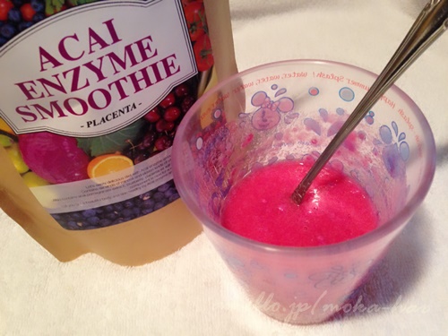 付属のスプーンで3.4杯入れ水などで200mlをシェイカーに入れて フリフリっと混ぜあわせたら、完成のスムージーです お水で溶いてみると、すごく鮮やかな色のスムージーが完成 炭酸水や、お水などで溶くとさらっとした口当たりのかるい さっぱりとした美味しいスムージーが完成します☆ 200mlというと、量が少ないような気がしますが… 適度な満腹感を得られますし、甘さもあるので満足できます もうちょっとまろやかな口当たりが好きな方にオススメなのは 牛乳・豆乳・ヨーグルトと合わせていただく方法 トロンと...