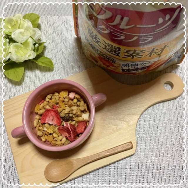 6種のビタミン(ビタミンB1・B2・B6・ナイアシン・葉酸・E)鉄分・食物繊維など栄養バランス満点です。 そのままでも美味しく食べることができますが 牛乳・ヨーグルト・豆乳などをかけるとより美味しく食べられます。 大きくカットして贅沢に使用した朝摘みのいちご 皮付きのスライスりんご・大粒のサルタナレーズン・無添加のかぼちゃの種が 見た目も華やかで食感もサクサク感が増していて飽きない美味しさです♪