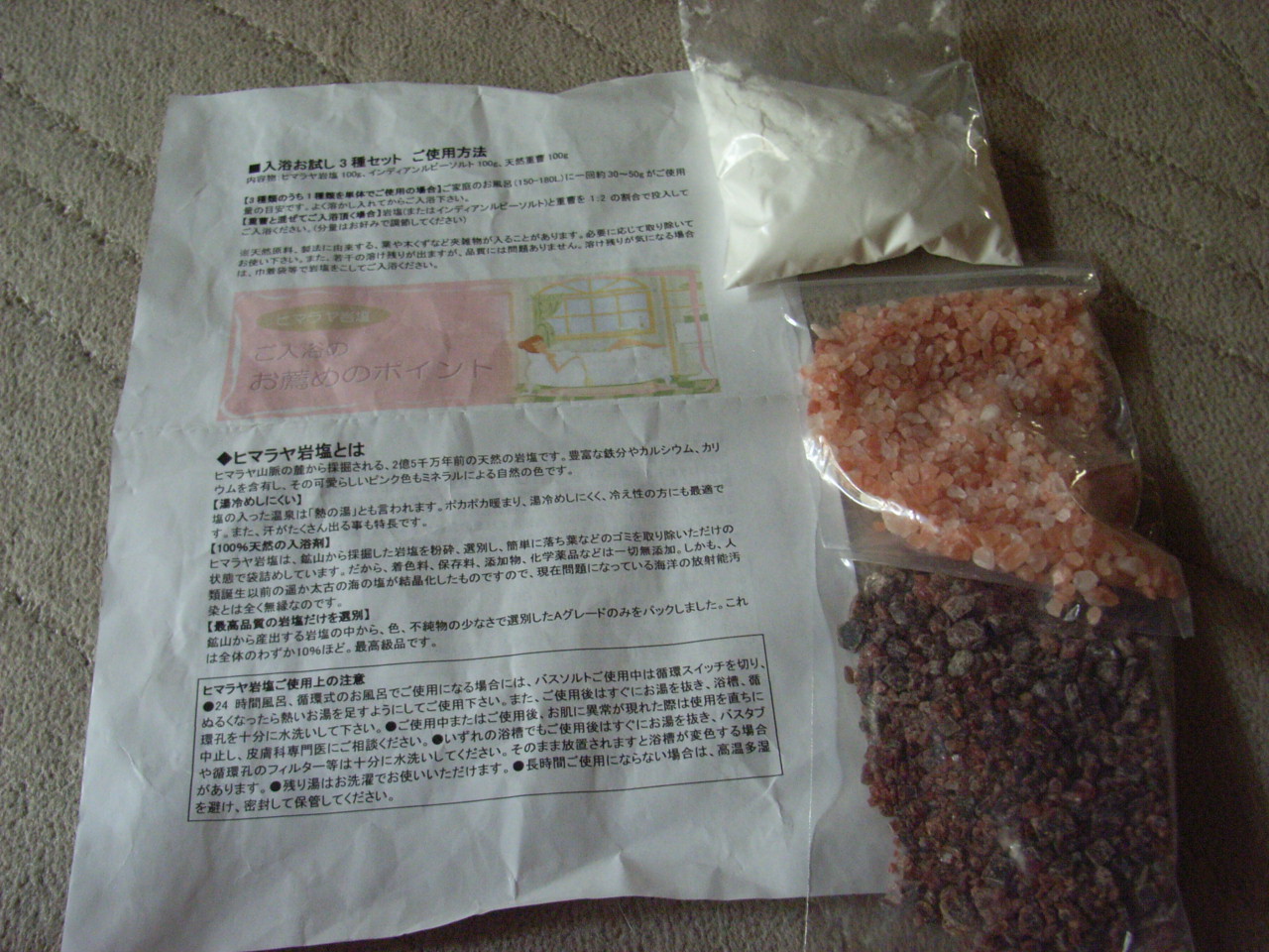 イマドキ女子の無料スマホセミナーに参加した際にいただきました。 ヒマラヤ岩塩100g インディアンルビーソルト100g 天然重層100g の3種をいただきました。 ・ヒマラヤ岩塩100g ・インディアンルビーソルト100g ・天然重層100g ピンク色のヒマラヤ岩塩から試しましたが、じっくり入浴したところ、 汗が出る出る! なかなか温泉に行かれないけど、温泉気分を味わえてよかったです。