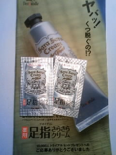 ☆ボディケアアイテム(4) サンプルをもらったので使ってみました。ボディケアでも足の匂いのことは案外忘れがちです。このクリームは足の裏や足の指の間に塗ると、嫌な匂いが抑えられます。1回塗っただけで1日効果が持続するのでとても便利です。特にこれからの時期は、足に汗をかいて蒸れるので必需品になりそうです。清潔な足に塗るのがポイントだそうです。出かける前には足を洗ったほうが良さそうですね。気に入ったので、現品を書くことにしました。オススメです。