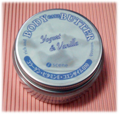まさにヨーグルト&バニラのお菓子のような香りに、思わず食べたくなってしまいます。^^ 柔らかなテクスチャーで、カサツキが気になる肘と膝に使ってみましたが、ボディケアバターといってもベタ付きはなく、かつお肌がしっとりします。