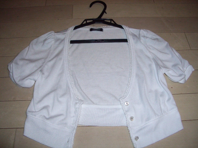 今まで割とワンピースは避けてきたが 今年の夏は挑戦しようと思う! …とはいえノースリーブワンピは ぶっとい二の腕が気になるので このボレロでカバーしようと企んで購入。 白でデザインも無難だしなかなか気に入ってます♪