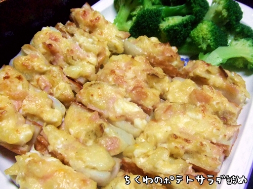 おつまみやもう一品欲しい時にぴったりの簡単レシピです。 ポテトサラダが余った時にも丁度いいですよ。 ,舛わを縦半分にしたら、食べやすい大きさに切ります。 ⇒召辰織櫂謄肇汽薀世魴衂分に詰め、マヨネーズ・粉チーズを上からかけます。 トースターでうっすらと焦げ目がつくまで焼いたら出来上がり! マヨネーズをかけなくても、ポテトサラダの味を少し濃いめにすれば大丈夫です。 とっても簡単で新じゃがが美味しいこの季節にぴったりですよ★
