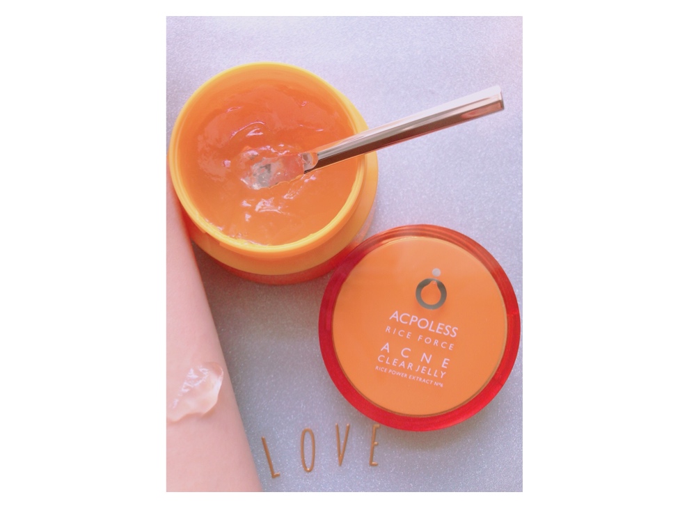 RICE FORCE アクポレス アクネクリアジェリー 50g 約2ヶ月分 6000円 薬用クリアジェル 化粧水の後に専用のスパチュラひとすくいを顔全体に塗ります。 ゼリーのようなプルプルのテクスチャーで少しの量で顔全体にジェルが伸びます。肌に優しい膜を張っているような感覚で肌がもっちりします。 ユーカリやローズマリーなどのハーブのさわやかな香りです。 MADE IN JAPAN 専用のスパチュラは別売りで200円