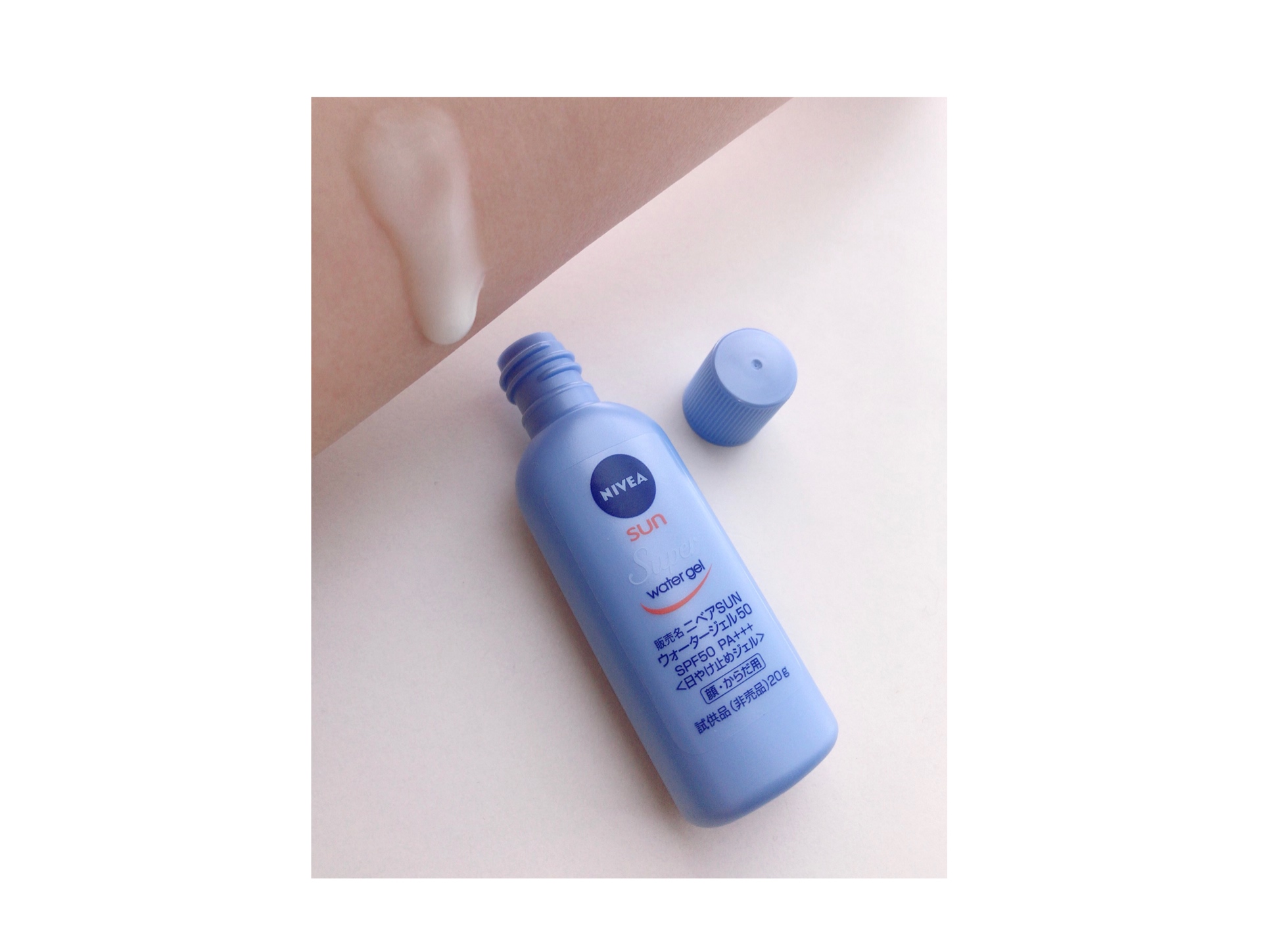 ニベア花王 ニベアサン スーパーウォータージェル SPF50 PA+++ 乳液のようなテクスチャーで肌に伸ばすとサラッとスッーと化粧水のように伸びて香りもあまり感じないです。 SPF50PA+++なのにつけた感じが軽く負担がないです。 白浮きや乾燥も気にならないです。