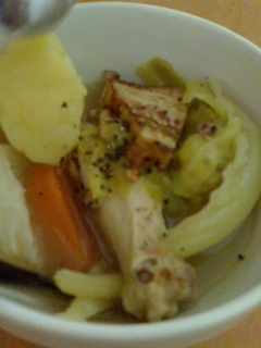 野菜だけだとさみしいので 鶏肉も入れてみましたが… 油が気になる場合はウインナーやハムでも。 塩コショウより、粒コショウを入れるほうが ただ野菜をコンソメで煮込むだけで簡単なのに おいしいです。