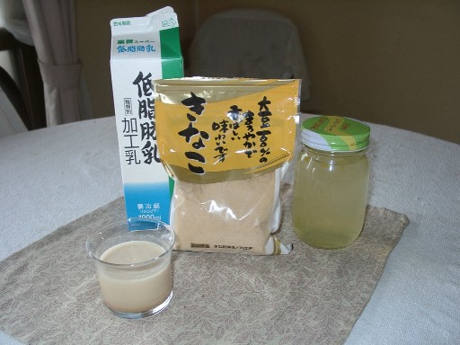 *☆*――*☆* この夏のダイエット *☆*――*☆* お湯を注ぐだけで簡単においしいきな粉牛乳が作れます。 豆乳とまぜて豆乳きなこドリンクも簡単に作れる。 甘さ控えめにしておりますので甘さが欲しい方はシロップやハチミツを足してください。 きなこのイソフラボンがお通じを促し、大人のニキビもすっきり♪ 作り方 きなこ大さじ2〜3に少しの熱湯を入れ練ります。牛乳200〜250ccを入れ混ぜる。