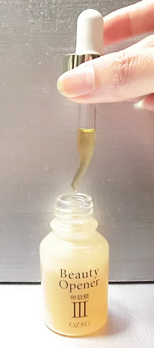 卵殻膜エキスを94%配合した美容液 容器にスポイトがついているので量の加減がしやすく 衛生的に使えるのでとても便利です! 洗顔した後、最初に使う美容液で伸びがいいので 少量つけるだけでいいようです。 目元と口元には少し多めにつけてみました。 ほんのりオレンジ色したサラっとした美容液です。 香りが独特で顔につけるとき少し気になります。卵殻膜のニオイなのかな? 使い続けると、肌のハリが出てきたのか毛穴が少し目立たなくなりました。 肌の調子もいい感じなのですごく気に入っています。
