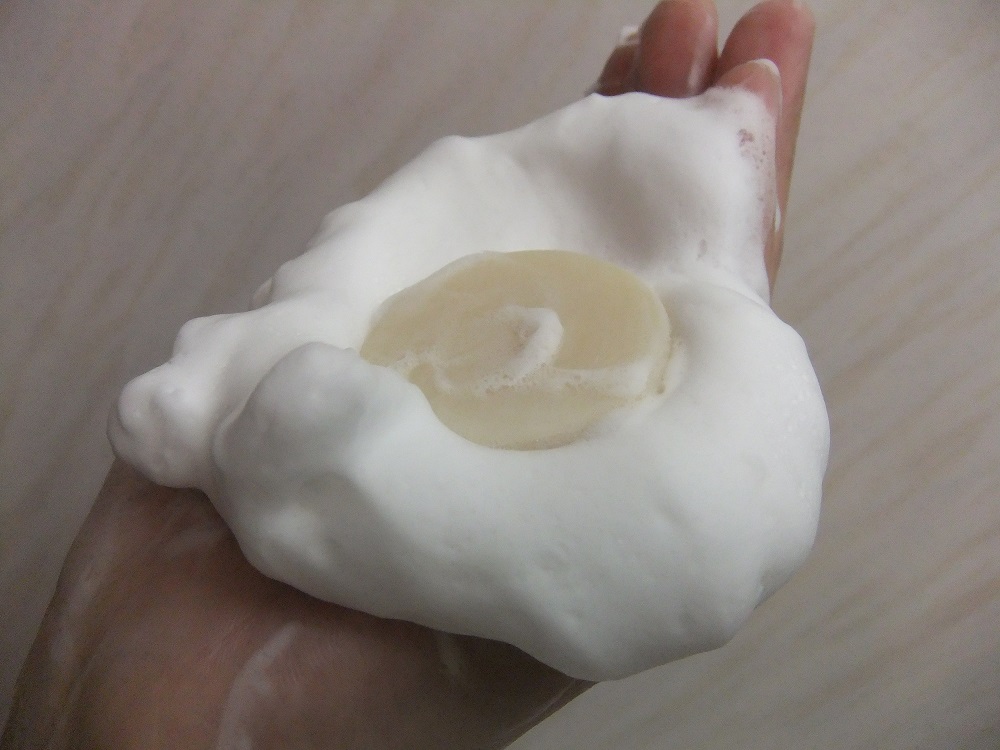 ホタテ貝殻抽出の抗菌成分スカローを配合した加齢臭専用石けん スカローは殺菌効果、消臭効果、洗浄効果、化学物質分解効果があり、それに+ヒアルロン酸、コラーゲンを配合しているので潤いのある肌にしてくれます キメの細かい濃密な泡 ミントの爽やかな香りがします 全身を洗ったら1分そのままで待ちます そうすることで有効成分を加齢臭源に充分作用してくれるみたい 洗い流した後はスッキリ、スベスベ肌に この爽やかなミントの香りが嫌なニオイを包み、香りを残してくれますよ