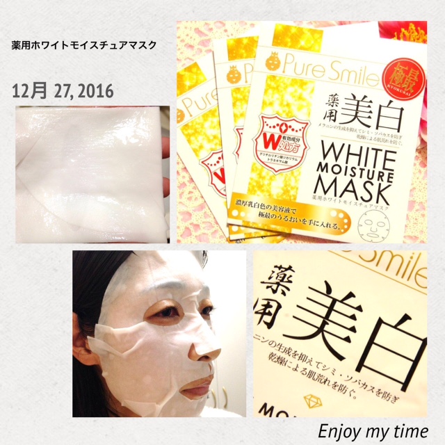 こちらは、有効成分トラネキサム酸とグリチルリチン酸ジカリウムを配合した、史上初の乳液タイプのW処方マスクになっています。 ピュアスマイルさまのマスクの中では高級なマスクになっているので二重パッケージになっていましたね〜 「薬用ホワイトモイスチュアマスク」の特徴 1.有効成分のトラネキサム酸がメラニンの生成を抑えてシミ・ソバカスを防ぎグリチルリチン酸ジカリウムが乾燥による肌荒れを防ぎ、お肌のキメを整えます。 2.オウゴンエキス、カンゾウフラボノイド、タイソウエキス、パールカルクエキス、シロキ...