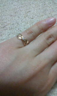 大好きなアガットのピンキーリングです。 ピンクゴールドですごくかわいい〜リボンの真ん中にダイヤが入っているんですよ♪ お気に入りで常につけてます!! 幸せは右の小指から入って、左の小指から逃げるということで、左の小指に指輪をつけていたら幸せが逃げないんですって(^3^)/〜☆