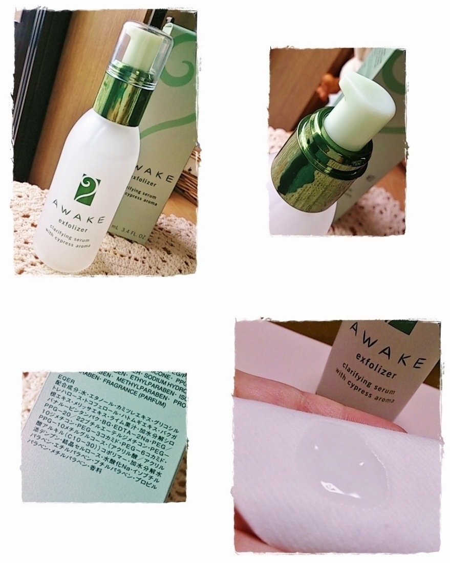 テクスチャー 少し白濁してとろみがある美容液ですが、全然ぬるぬるしていなくてべたつきもなく、コットンで拭き取っているときはすごくさらさらな感触でした。 香り AWAKEを象徴するサイプレスの澄んだ香りがとても心地よいです。まるで森林浴しているかのよう 角質ケア効果 穏やかに優しく角質を取ってくれる感じ。使ったらすぐにつるつるになるとかではなく、毎日使用することで、余分な角質をたまりにくくして透明感ある肌に導いてくれます。 だから拭きとったコットンはあまり真っ黒にならず、ちょっと色がついたかな...