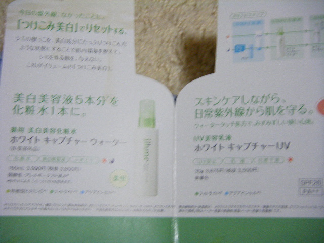 <紫外線対策> これは、サンプルでいただいたので試してみたんですが・・・。 美白美容液5本分を化粧水1本に、というキャチコピーにやられました!!つけこみ美白っていうのも、新しい感じがしますし。 薬用だし、低刺激。しかも、あまりこってりしてなくて、使いやすい!でも、リッチな使用感です。 乾燥肌〜普通肌の人むきかな?と思います。