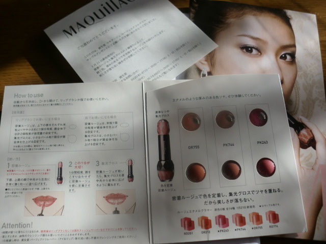 マキアージュの口紅のサンプルです。 リップとグロスがセットになっていて 色がおちないだけだなく、唇のスキンケアもしてくれます。 口紅をぬって1分置いて乾かし、 そのあとからグロスを塗ると ぷるんとしたとてもきれいな唇が出来上がります。 1分おくことによりルージュをより唇に定着させてくれます。 いろんな色を使ってみたい商品です。
