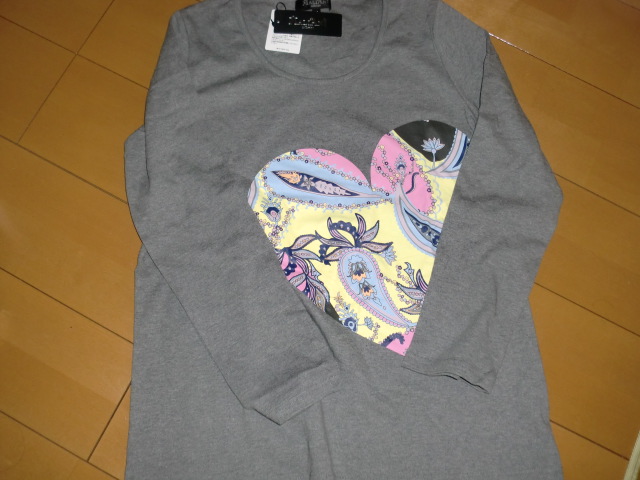 通販で購入できるかわいい春もののTシャツです。 生地が厚めで透けて見えません。 色もグレーで気に入ってます。 ハートのペイズリー柄も凝っていてとても綺麗です。 綿100%でこれからの季節に合わせやすい1枚です。 体型をカバーしてくれるシルエットもうれしいです。