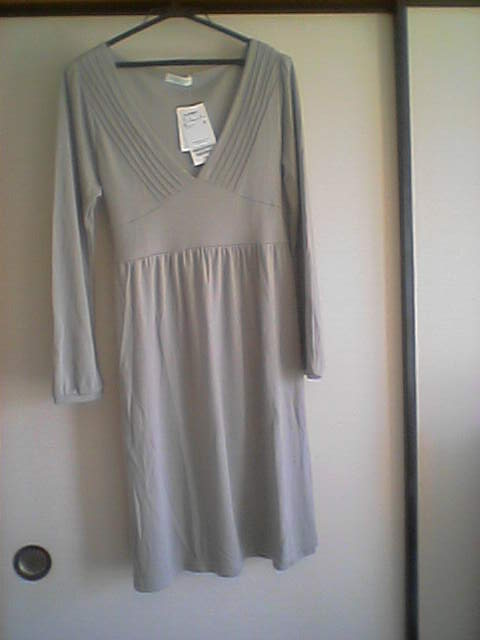 薄いグレーのワンピースです。 ポリエステル65%、レーヨン30%、ポリウレタン5%で、肌触りは柔らかく良いです。 共布ベルトがついていて、ウエストにアクセントを付けることもできます。 袖口がふんわりしていて、ボタンもかわいい感じです。 これから、もう少し涼しくなったら活躍してくれそうです。