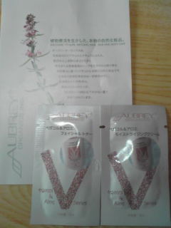 オーブリーオーガニスク ベガコル&アロエのサンプルです。 内容は ・フェイシャルトナー(センシティブ肌用) ・モイストライジングクリーム(センシティブ肌用) の2つです。 オーブリーはアメリカの天然成分だけで作られたナチュラルコスメ。 このシリーズにはいろんな肌の人のために何種類もあります。 ・ドライ肌用 ・コンビ・ドライ肌用 ・ノーマル肌用 ・コンビ・オイリー肌用 ・オイリー肌用 ・センシティブ肌用 と6種類とあるので自分の肌にあったものが選べます。 わたしは敏感肌用のセンシティブ肌用を...