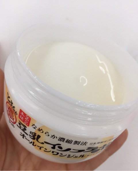 白いジャータイプです。 ロゴが黒字で、大きめに書かれています。 これ1つで、化粧水・美容液・乳液・クリーム・パック・化粧下地の6役を担ってくれます。 オールインワンジェルなので、時短ケアできます。 忙しい方にもぴったりです\(^o^)/ 豆乳発酵液・ダイズ種子エキス・ダイズタンパクの3つの大豆由来成分を配合して、お肌をぷるっとさせてくれます。 ジャーを開けると、とってもみずみずしい、ぷるんぷるんのジェルです。 容器を動かすと、ジェルもぷるん♪と揺れて、柔らかいのがよくわかります。 手に取...