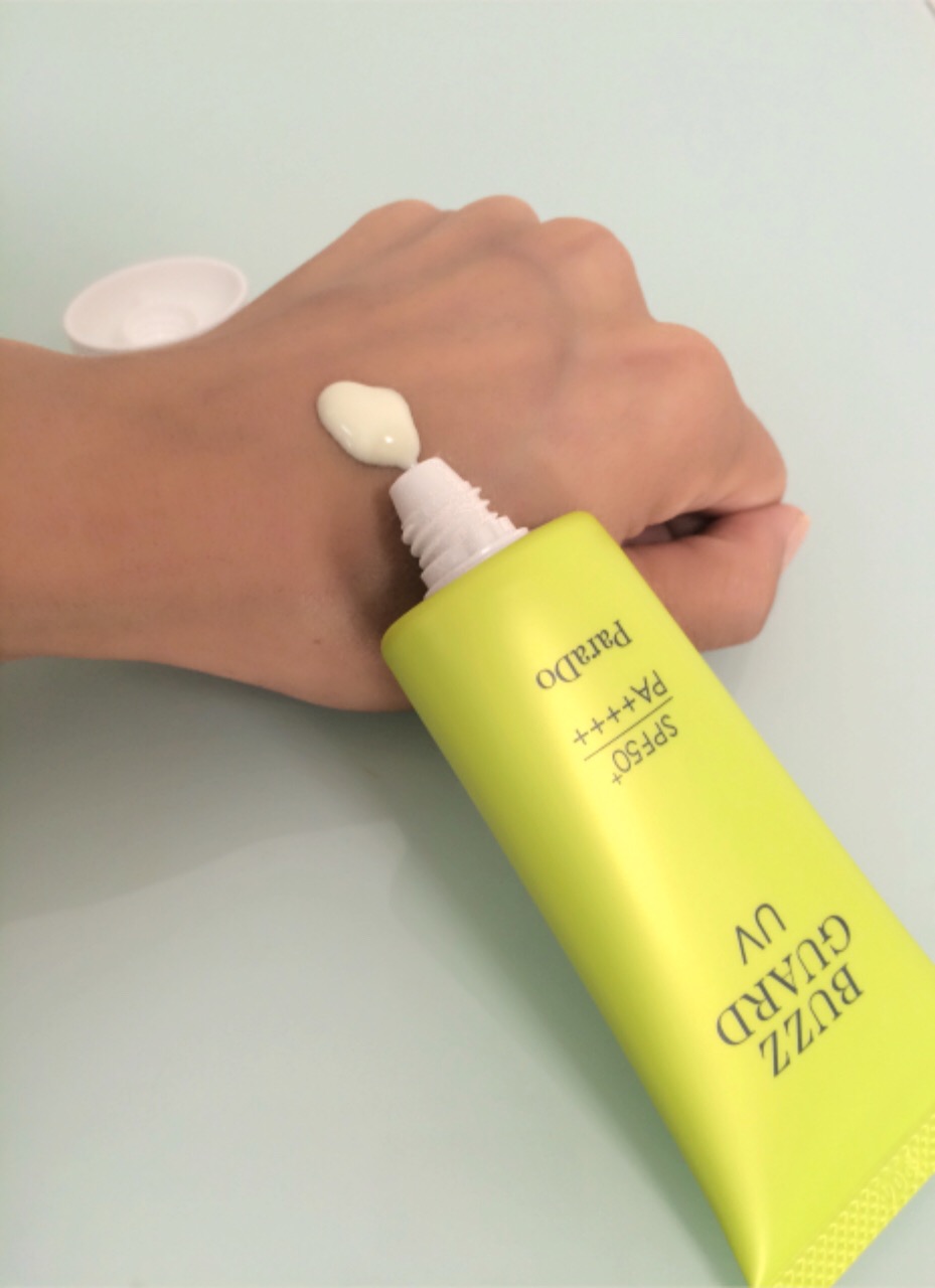紫外線対策はもちろん、虫対策もできちゃうUVバズガード。 SPF50+PA++++でUV−A、UV-Bを長時間ブロックして、レモンユーカリに含まれる成分<メンタンジオール>と<シトロネラ等の天然ハーブの香り>で外敵もブロック。 手に取ってみるとレモンユーカリのいい香りです。 ウォータリージェルなのですごく軽いつけ心地。サラサラでべたつかず、みずみずしい仕上がりになり、白浮きゼロです。 私は肌乾燥がひどいので、心配だったのですが、バズガードUVはウォーターカプセル処方で肌表面に<水のヴェール>を作ってくれるから、...