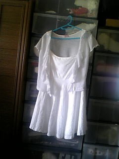 この夏に、1枚、欲しかった、白のスカート、 先日、ショッピングモールのバーゲンで、買いました。 夏物処分のポップに、引かれフラット覘いたところ、 やすーい! しかも、綿のレース生地で、たくさんフレアーが入ってて、 かわいい! ひとめぼれして、買いました。 あまり安かったので、マネキンさんが、 このスカートと一緒に,着ていた、 白の半そでレース地カーディガンも、 ついでに買っちゃいました。 ちなみに、お値段は、スカート 500円 カーディガン 300円 勿論、税込みです。