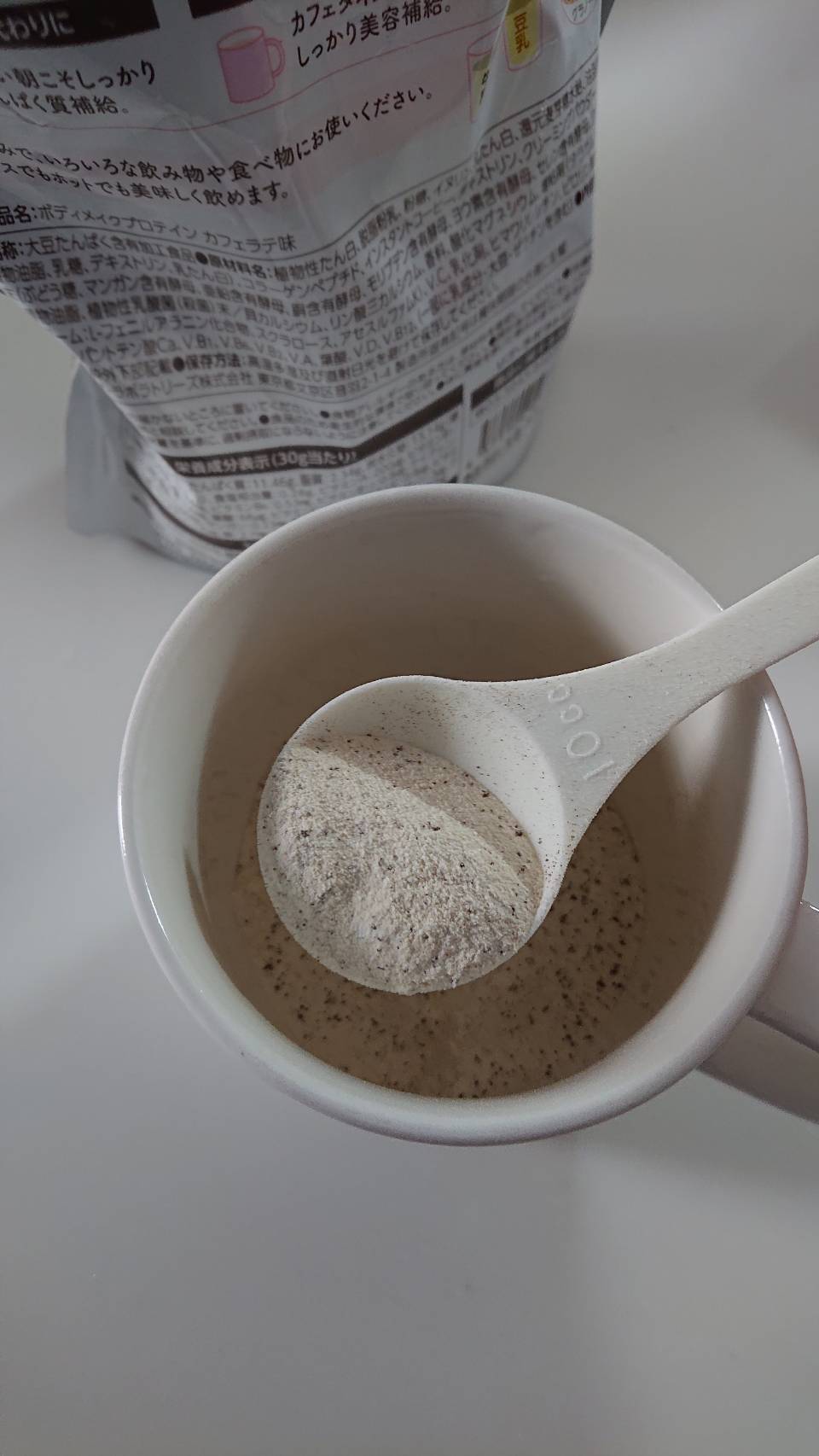 筋トレ女子の強い味方であるプロテイン。 このプロテインも、タンパク質はもちろんのこと。 女性に優しいコラーゲン・食物繊維・ビタミン・ミネラル等が配合されているそうです。 中はちゃんとスプーン付き。 置き換えでもいいし、ただ飲むだけでもいいそうです。 置き換えの時はスプーン1杯。 置き換えの時はスプーン4〜5杯使っています。 水に混ぜてもいいそうですが、私は牛乳と混ぜてみました。 量はスプーン4杯。 味はカフェオレっぽい感じ。プロテインっぽくはないです。 が、如何せん粉っぽい・・...