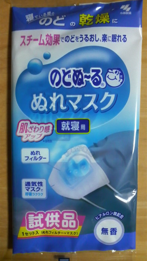 小林製薬ののどぬーる ぬれマスクです。 私は普段、鼻やのどの風邪をひくと、夜寝るときにマスクをして寝ます。 乾燥が軽減されて、のどの痛みもやわらぎます。 乾燥するこの時期の就寝時、ホテルや飛行機など乾燥の気になるときにも重宝しそう。