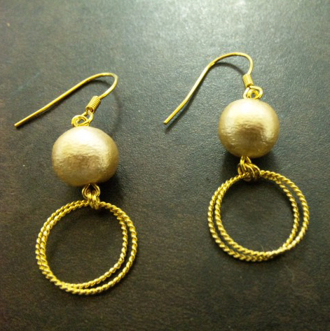 春のファッションアイテム ゴールドがキラキラのゆらゆらピアス。 2連の輪っかの上は、コットンパール。 コットンを圧縮した綿球体の表面にパール加工が施された模造真珠。 凹凸があって、セミマット。 だけど上品に輝いてくれます。 そしてかなり軽いです。 シンプルなデザインだけど、顔周り華やかです♪
